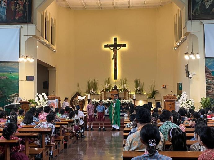 Setelah perayaan ekaristi, seluruh siswa, bapak ibu guru dan tendik, komite sekolah dan orang tua wali murid mengikuti acara opening ceremony di lapangan SD Santo Antonius I.
