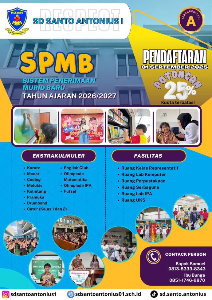 Bagi bapak/ibu orang tua yang tertarik untuk menyekolahkan putra-putrinya di SD Santo Antonius I dapat menghubungi CP yang ada di e-flyer berikut atau dapat datang langsung di sekolah kami. Bagi bapak/ibu orang tua yang ingin mendaftarkan putra-putrinya pada bulan September ini ada potongan sebesar 25% dan kuota terbatas.
