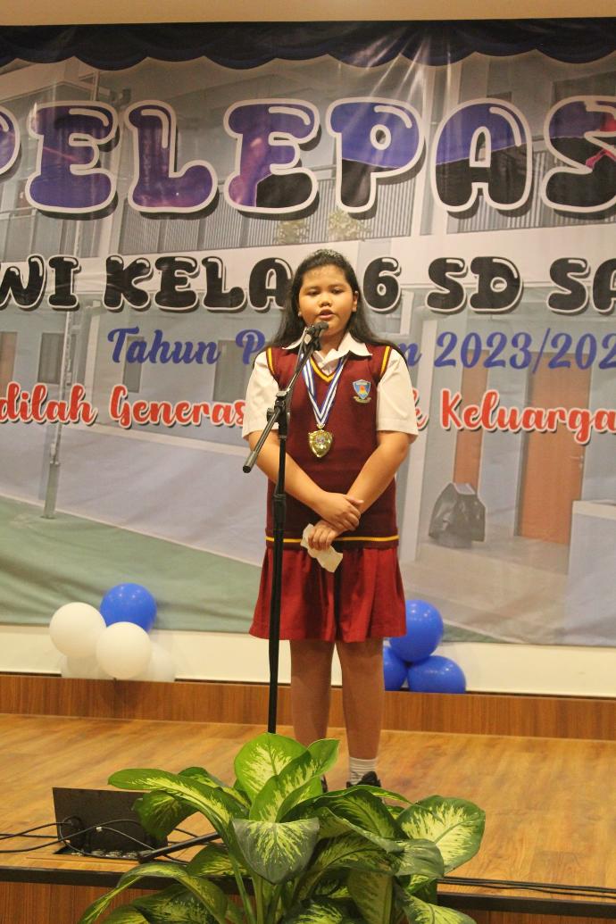 Selanjutnya, salah satu Perwakilan Siswa, Bellvania Marieleta Pasaribu, menyampaikan pidato singkat sebagai ungkapan terima kasih kepada para guru dan orang tua yang telah memberikan dukungan dan bimbingan. Dalam pidatonya, Bellvania juga mengajak teman-temannya untuk terus berprestasi dan menjaga nama baik sekolah di manapun mereka berada.